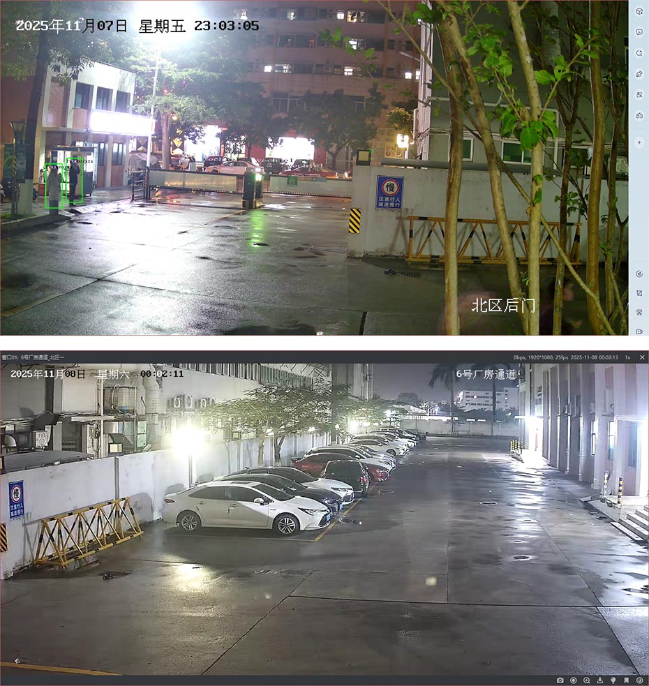 园区现已部署约300台800万像素全彩感光摄像机,搭配4mm与6mm焦距镜头,实现关键区域全覆盖与细节精准捕捉。即使在夜间、阴雨或雾霾等低光照环境下,摄像头依然能呈现清晰的全彩画面,实现了园区24小时全天候、无死角的安全监控,极大提升了夜间及恶劣天气下的边界管控能力。