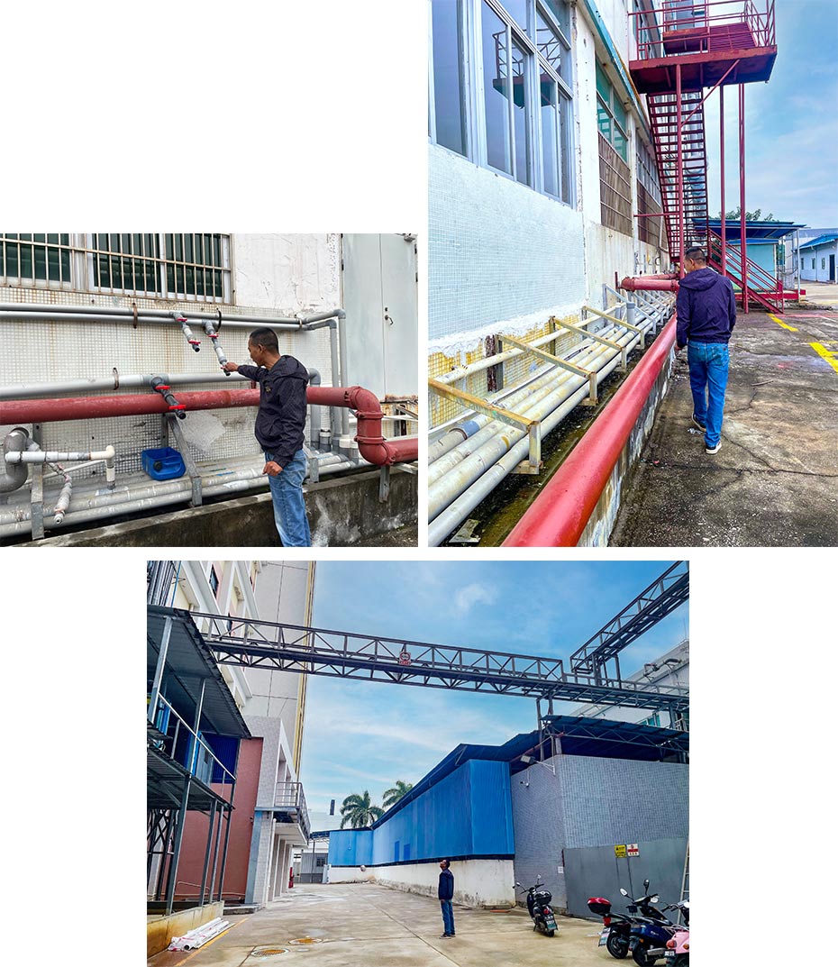 园区的污水管网,如同人体的“动脉”,在墙边或空中廊架中清晰可见。巡查这些“生命线”,是他们的日常工作。他们仔细检查管道是否畅通、接口是否完好,确保每一滴废水都安全地奔赴下一站,为园区集中式污水处理厂的稳定运行筑牢第一道屏障。