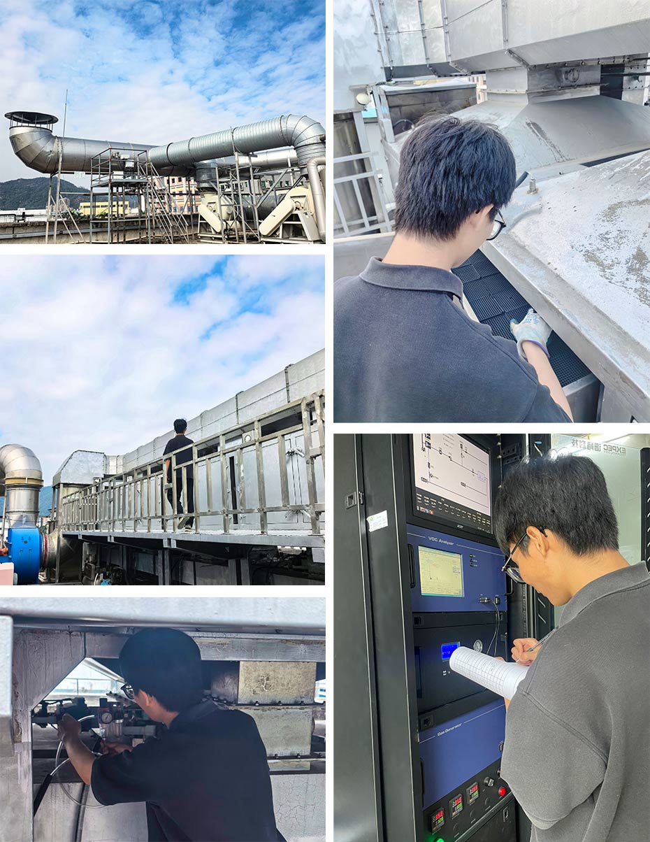 楼顶作业,实地查验: 他们不惧艰辛,定期登上厂房楼顶,近距离巡查VOCs废气处理设施的运行状态,检查风机、药剂、活性炭,不放过任何一个细节。
