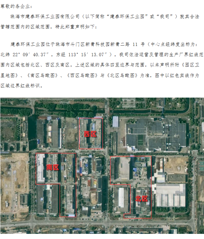 关于明确珠海市建泰环保工业园有限公司园区管辖范围的声明