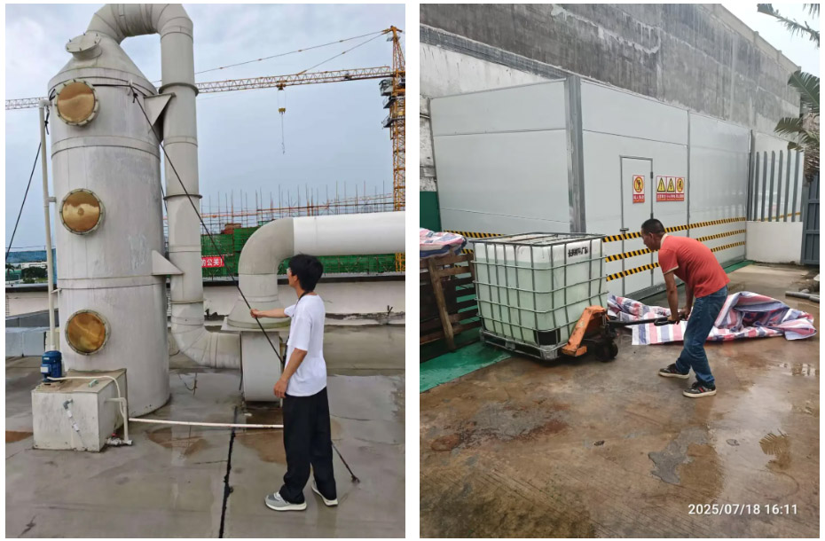 重点保障: 专业人员对楼顶VOCs处理设施(废气塔、管道等)进行防风防雨检查,确保环保设施稳固安全。